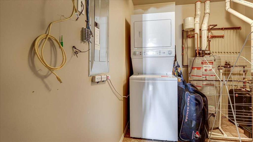 Enjoy the convenience of in-suite laundry located in the utility room, along with a covered south-west-facing deck—the perfect spot to unwind and take in the evening light. This unit includes two comfortable bedrooms, a well-kept 4-piece bathroom, and one assigned parking stall.