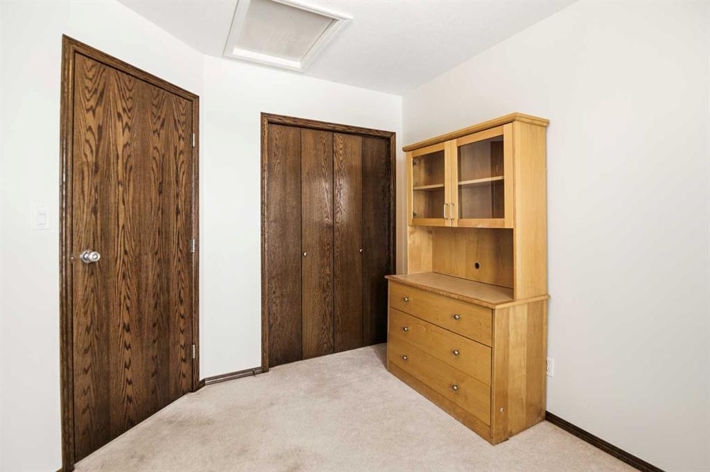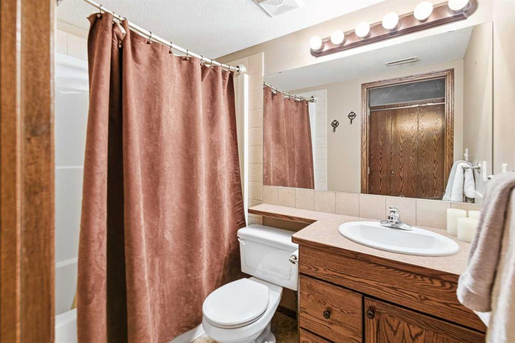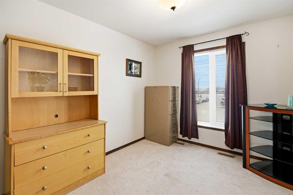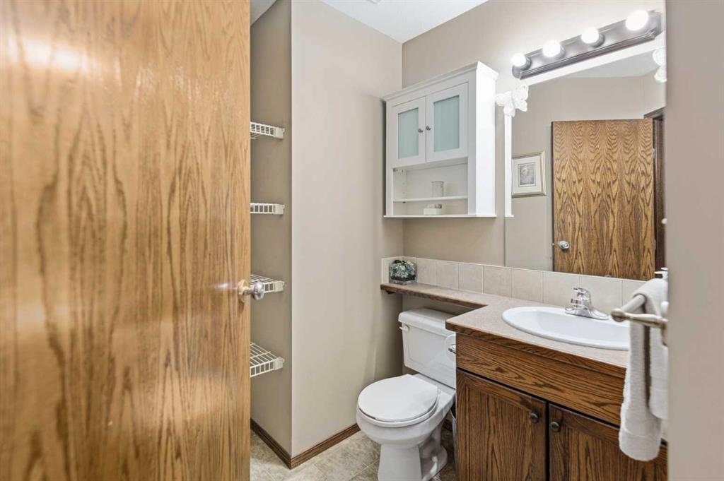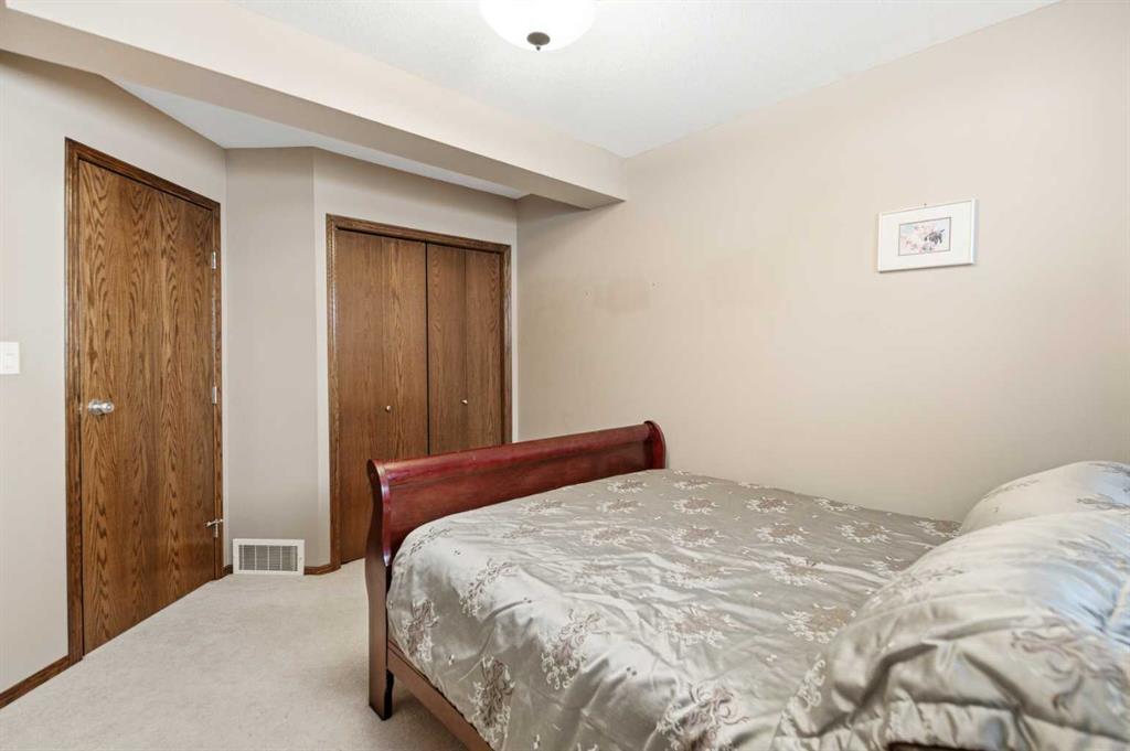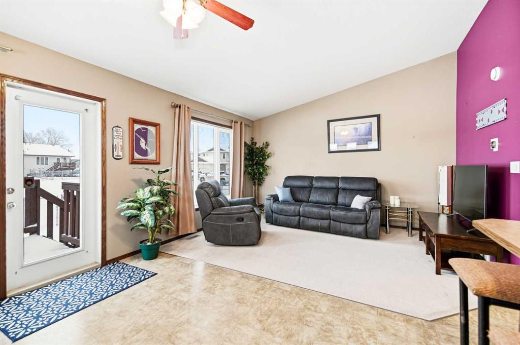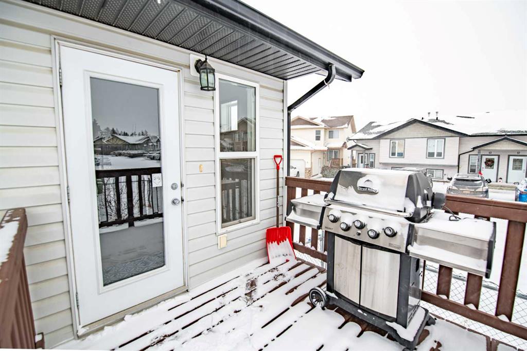 Enjoy the convenience of a move in ready townhouse in the well appointed community of Harvest Meadows! This 3 bedroom and 2 bathroom bi-level offers a spaciously bright entry, which leads to the open concept main living area with vaulted ceilings. The kitchen contains a pantry, full appliances, plenty of oak cabinetry with a built-in desk area, and large island for additional seating. Adjacent is the living room and dining area-suitable for a full table and accessibility to the back deck. The upper level finishes with a spacious two piece bathroom with built-in shelving and bedroom with a full sized window. The fully finished basement is set up with a large primary room with dual closets and the ability to accommodate extra furnishings. There is a 4 piece bathroom situated close by, a third bedroom, separate side by side washer and dryer, and a utility space that conclude the property. The back exterior is fully fenced with seasonal shrubs and overlooks a green space. The deck has received an updated finish and there is additional room for storage below the back steps. There is a large concrete parking stall towards the front of the home with the added perk of exterior maintenance. There is a full playground and field situated close by, alongside access to schools, walking trails, amenities and much more!