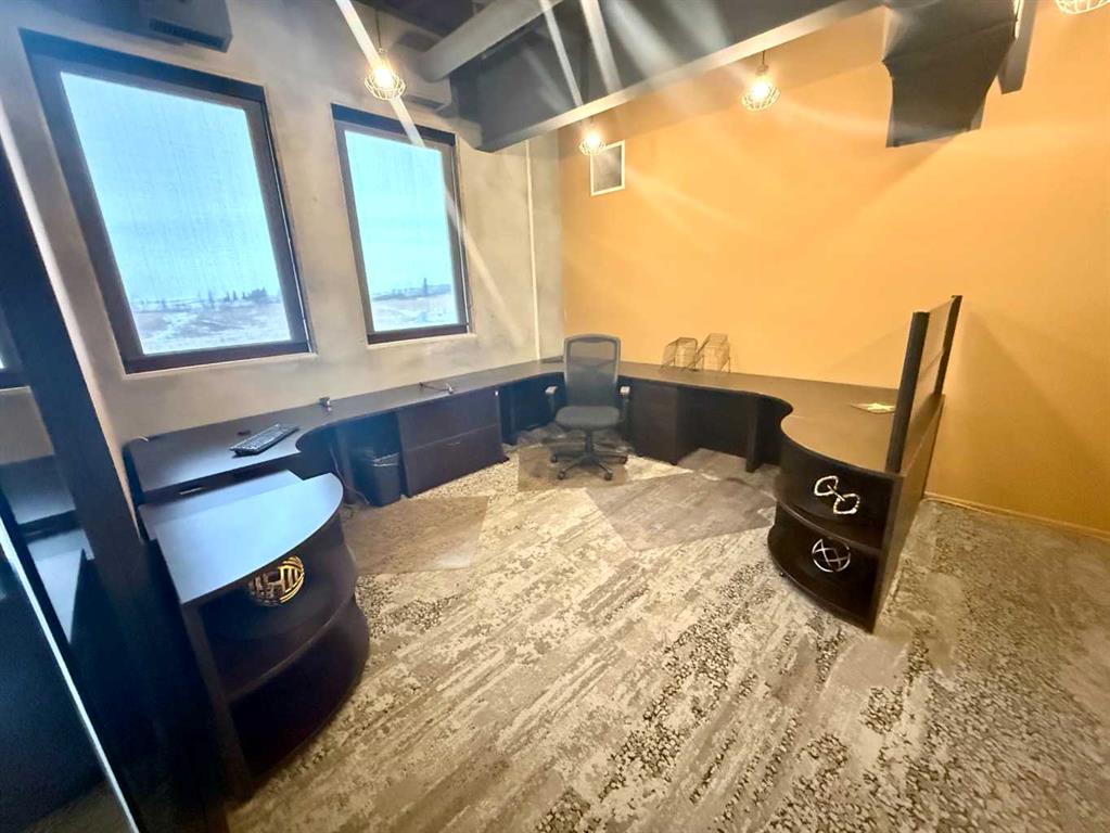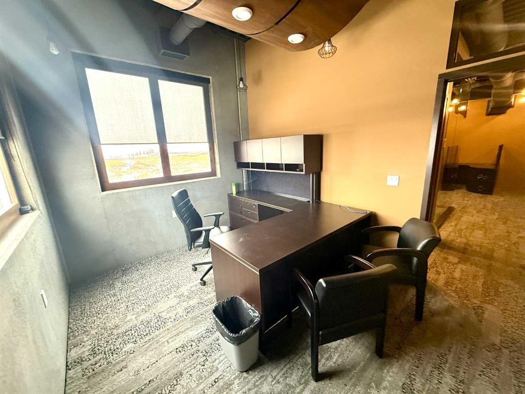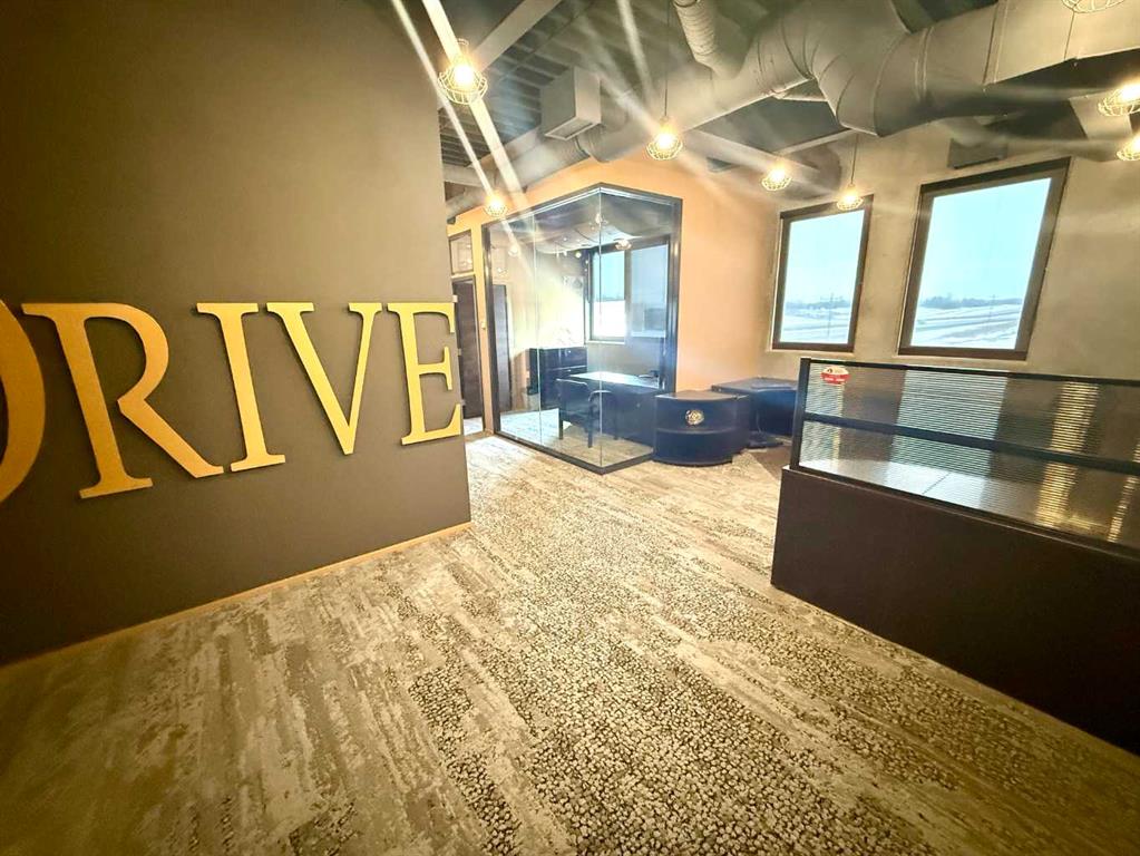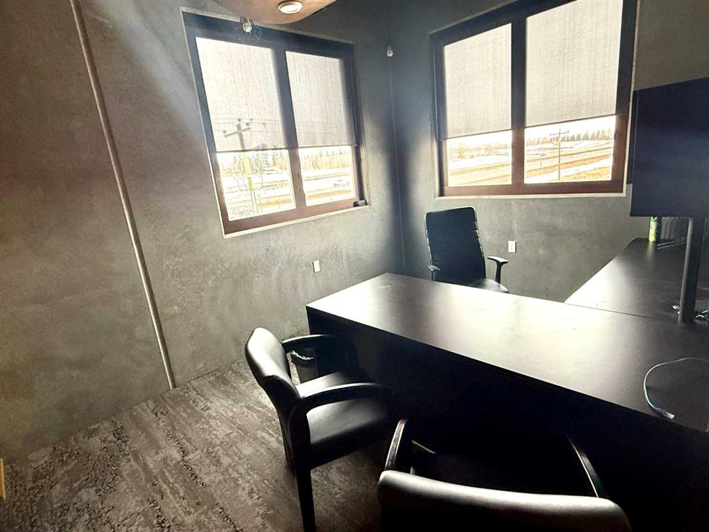 STUNNING OFFICE SPACE FOR LEASE! Featuring Ultra-High end finishes, Glass walls, granite counters, built-in ice machine & more. Featuring Exposure along QE2 and situated on the second floor of the Wood Group Business Centre, this 1111 SQ FT 2-office, boardroom, private bath and spacious reception area screams "Take me now!" Impress your clients and suppliers alike, with award-winning finishes throughout. Make it fun to go to the office, in this efficient CONCRETE BUILDING, with Front and rear parking with a paved lot. Office 1: 9'10"x11", Office 2: 9'10"x12", Boardroom: 11'9"x15'8", Open Office: 25'x9'. Storage mezzanine at the back for file storage. get into this space temporary or on a long term basis with lease rates starting at $16.00/PSF plus NNN costs of $4.00/PSF (includes everything except internet/ phones)