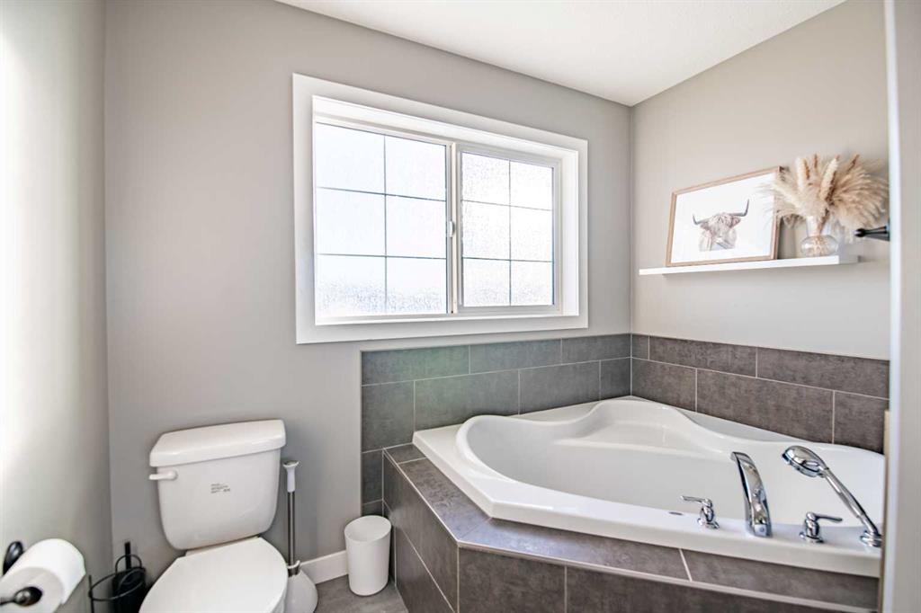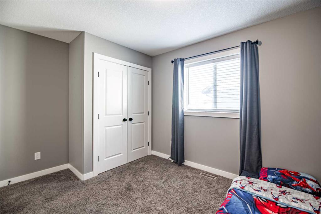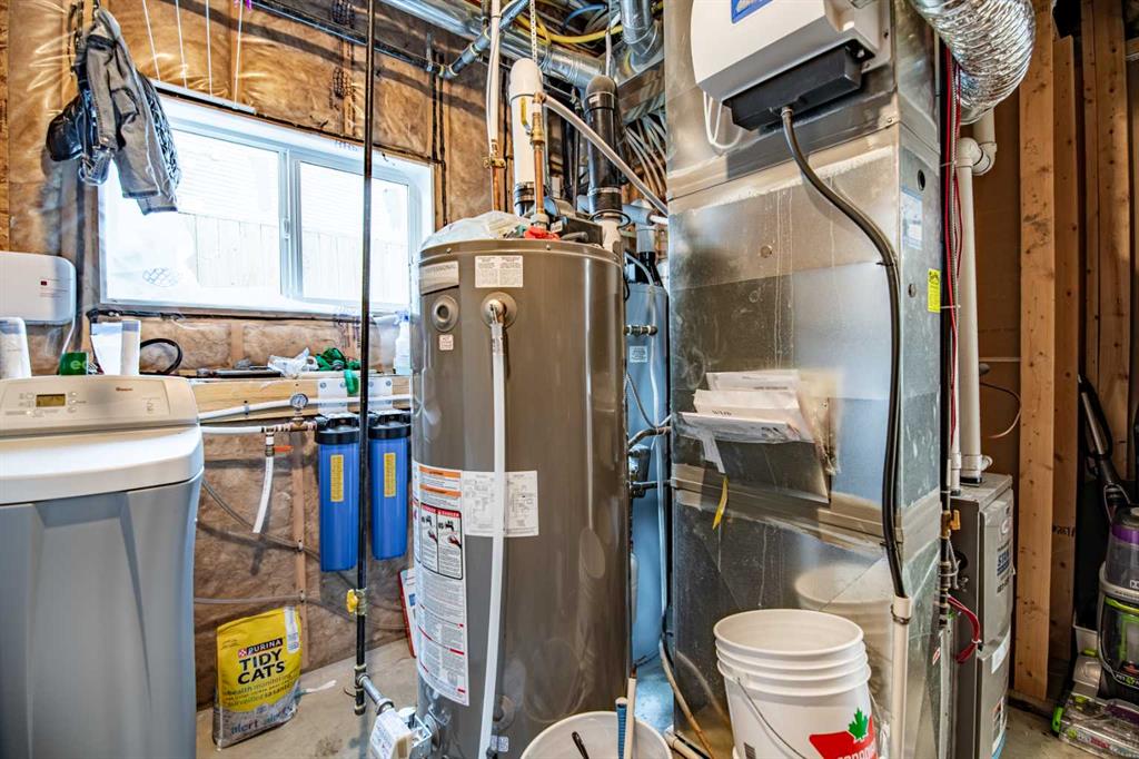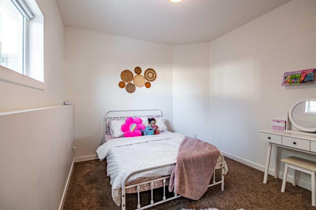 Welcome to this fully finished modified bi-level home in Blackfalds, ideally located on a pie-shaped lot and built for turnkey living. The maintenance-free front yard, stained concrete driveway, and permanent outdoor lighting offer standout curb appeal. Inside, enjoy a bright open-concept main floor with vaulted ceilings, large windows, a gas fireplace with black rock finish, and a stylish kitchen featuring quartz countertops, stainless steel appliances, a pantry, and island seating. A rear deck (with gas hook up) overlooking the entire backyard, Two bedrooms and a full bath complete the main level, while the private upper-level primary suite includes a walk-in closet and ensuite. The walkout basement is warm and inviting with 9’ ceilings, in-floor heat, large windows, a wet bar, an additional bedroom, and full bathroom—perfect for entertaining and summer living. Upgrades include a 3-stage whole-home water filtration system, water softener, two hot water tanks, central A/C, central vacuum, and solid core doors. Step outside to the massive lower 29’ x 14’ deck, fully fenced yard, and garden shed. The oversized 22’ x 25’ heated garage features hot and cold water with a sink. A rare walkout bi-level with this level of finish—move-in ready and built for comfort.