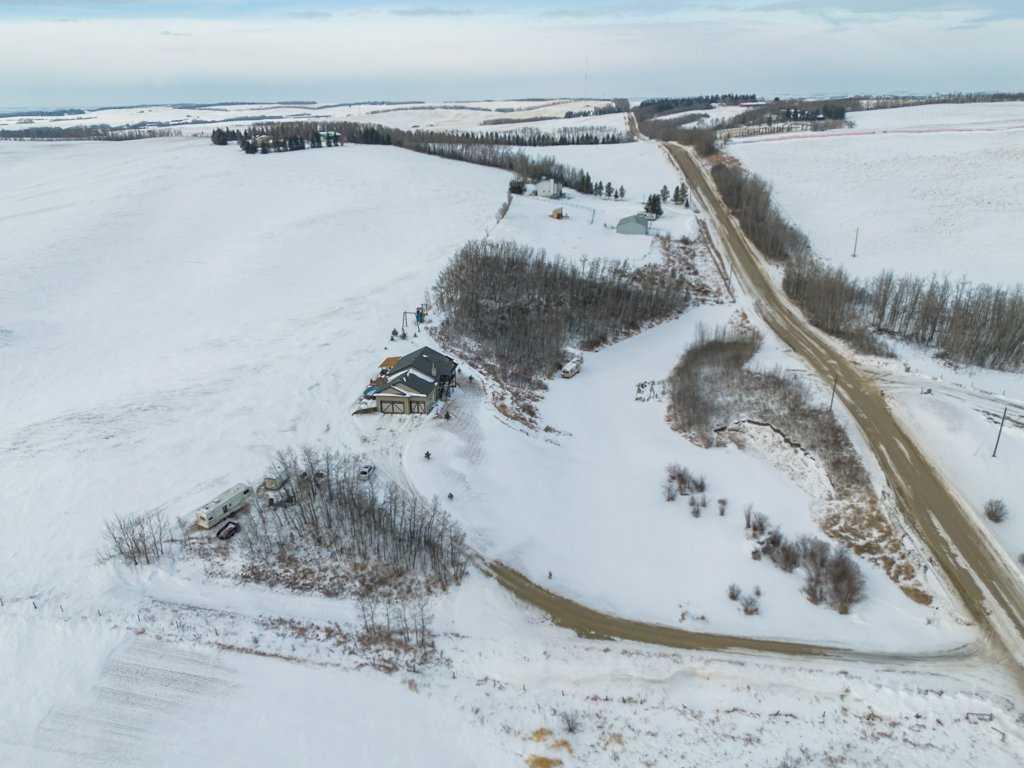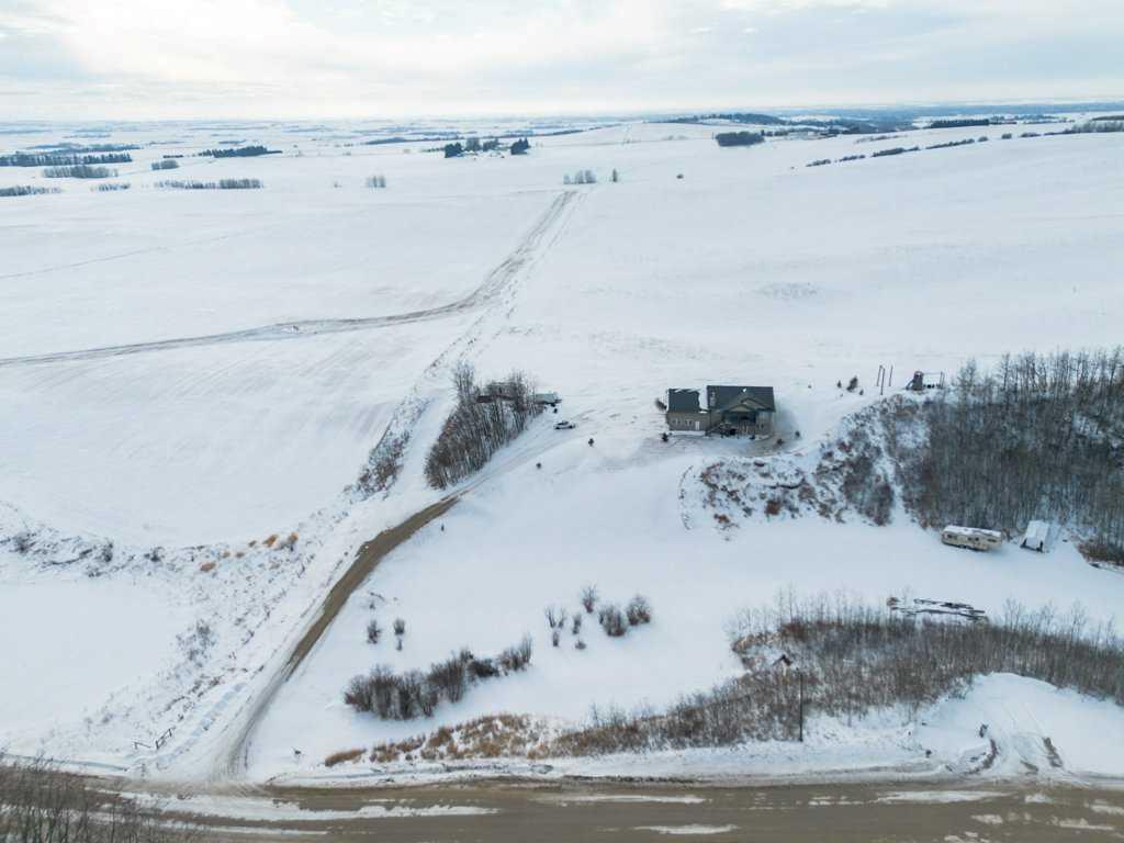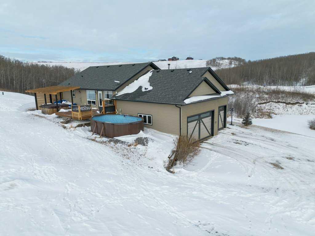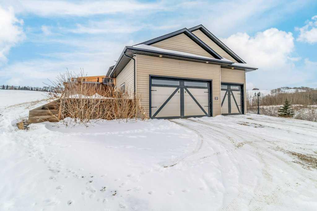 Hillside Bungalow on 3.68 private acres is just 10 minutes from Red Deer. This exceptional Trueline-built walk-out perfectly balances peaceful country living with convenient access to the city. Designed with quality and comfort in mind, the home welcomes you with vaulted ceilings and an open-concept main floor featuring a warm and inviting living room with a gas fireplace and stunning views of the surrounding countryside. The spacious kitchen is complete with maple cabinetry, stainless steel appliances, a gas stove, and a generous pantry, while the island features a bamboo countertop with ceramic sink, providing both style and functionality at the heart of the home. The main level hosts two bedrooms, including a primary suite with a 5-piece ensuite, a soaker tub, separate shower, and walk-in closet. A convenient laundry room and mudroom complete the main floor layout. The fully finished walk-out basement impresses with 9-foot ceilings, in-floor heating, a cozy wood-burning fireplace, and a dedicated media room. Entertain with ease in the bar area featuring a small sink and bar fridge, perfect for hosting family and friends. Guests will appreciate the comfort of a 3-piece bathroom with shower, along with additional under-stair storage and a new in 2021, on-demand water heater. The triple car garage is insulated and has under slab heat with a bonus mezzanine for extra storage. Step outside to the expansive rear deck overlooking the backyard, where you can unwind in the hot tub and take in the peaceful surroundings and beautiful views. The property is serviced by a well, tank and field system with a 2014 pressure tank, and shingles have been replaced on 2017. This remarkable acreage offers space, privacy, scenic vistas, and thoughtful upgrades throughout—an ideal place to call home.