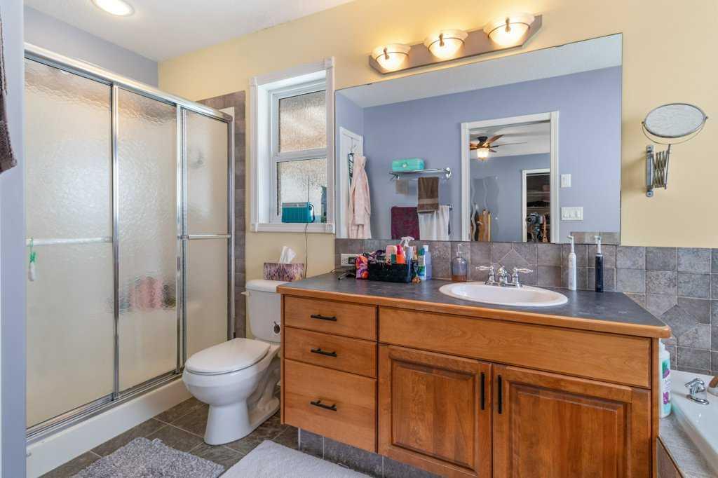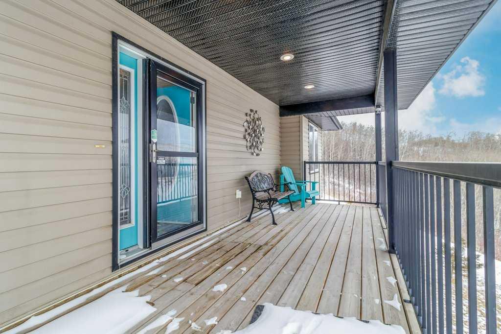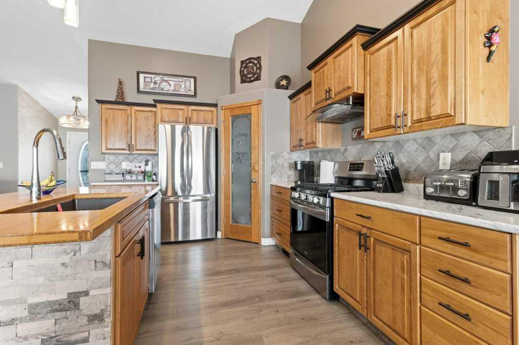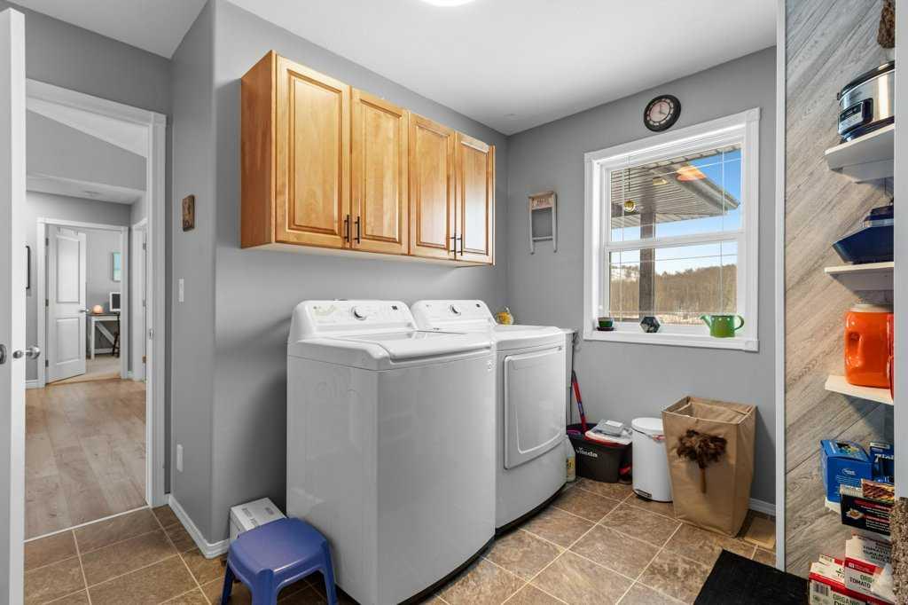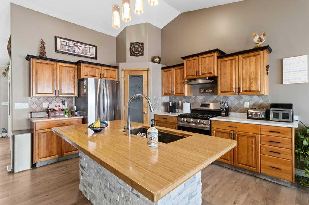 Hillside Bungalow on 3.68 private acres is just 10 minutes from Red Deer. This exceptional Trueline-built walk-out perfectly balances peaceful country living with convenient access to the city. Designed with quality and comfort in mind, the home welcomes you with vaulted ceilings and an open-concept main floor featuring a warm and inviting living room with a gas fireplace and stunning views of the surrounding countryside. The spacious kitchen is complete with maple cabinetry, stainless steel appliances, a gas stove, and a generous pantry, while the island features a bamboo countertop with ceramic sink, providing both style and functionality at the heart of the home. The main level hosts two bedrooms, including a primary suite with a 5-piece ensuite, a soaker tub, separate shower, and walk-in closet. A convenient laundry room and mudroom complete the main floor layout. The fully finished walk-out basement impresses with 9-foot ceilings, in-floor heating, a cozy wood-burning fireplace, and a dedicated media room. Entertain with ease in the bar area featuring a small sink and bar fridge, perfect for hosting family and friends. Guests will appreciate the comfort of a 3-piece bathroom with shower, along with additional under-stair storage and a new in 2021, on-demand water heater. The triple car garage is insulated and has under slab heat with a bonus mezzanine for extra storage. Step outside to the expansive rear deck overlooking the backyard, where you can unwind in the hot tub and take in the peaceful surroundings and beautiful views. The property is serviced by a well, tank and field system with a 2014 pressure tank, and shingles have been replaced on 2017. This remarkable acreage offers space, privacy, scenic vistas, and thoughtful upgrades throughout—an ideal place to call home.