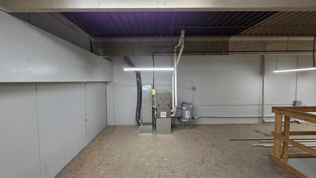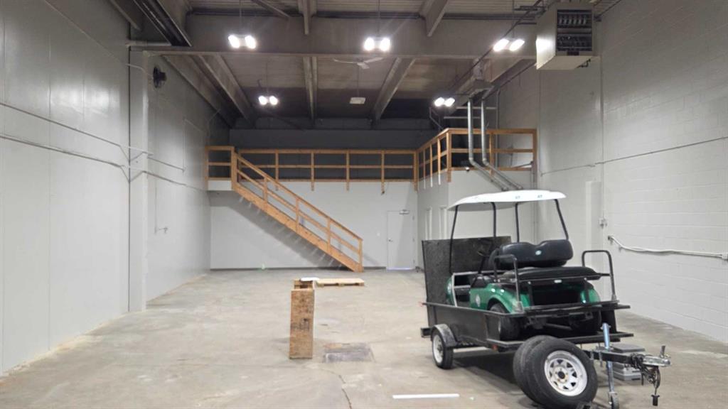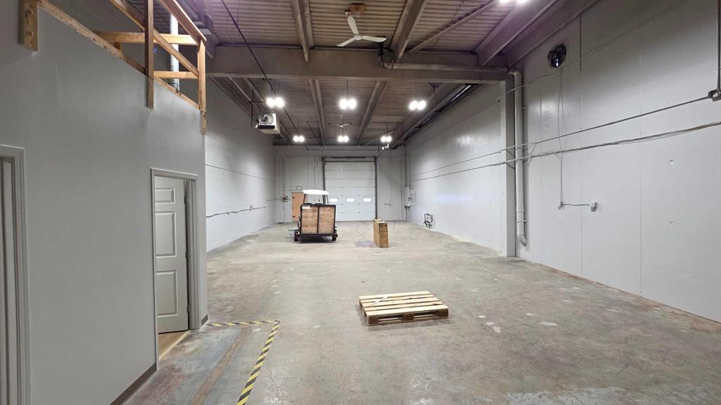 Warehouse area : 12 x 14 high Overhead door, 42 inch man door; floor sump, upgraded warehouse lighting, one radiant tube heater and one overhead forced air heater. Open mezzanine above the office and reception area. Vent fan on West wall. Two washrooms; located near front office area.
