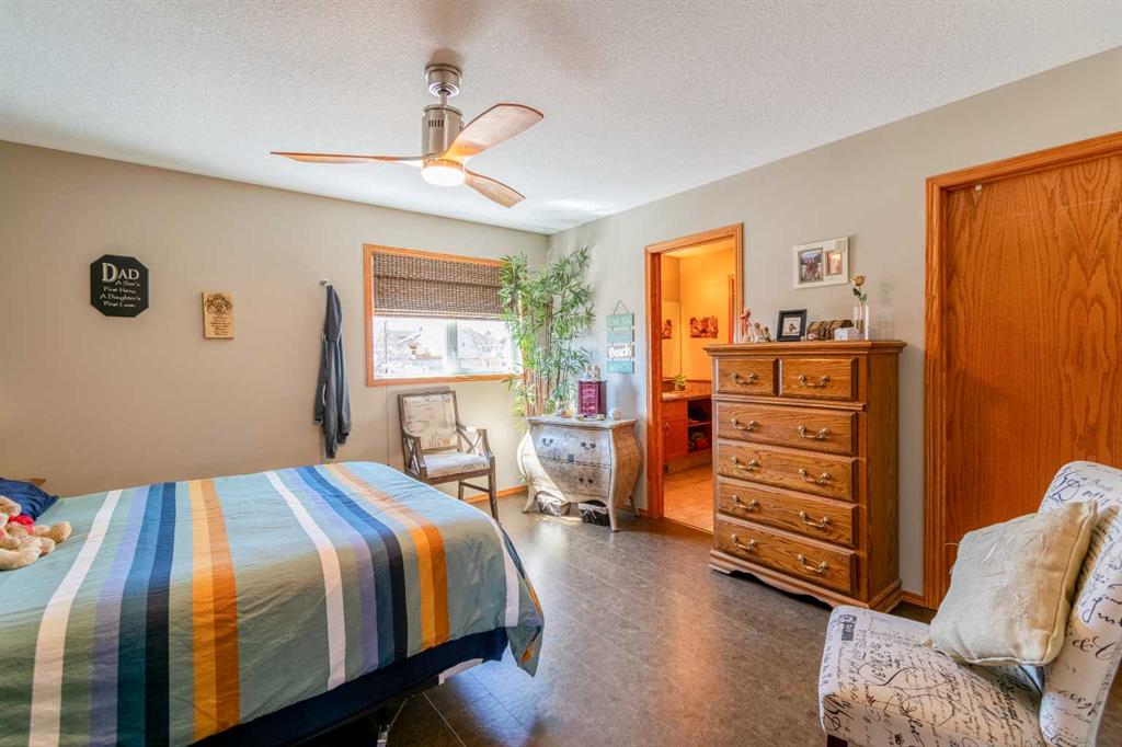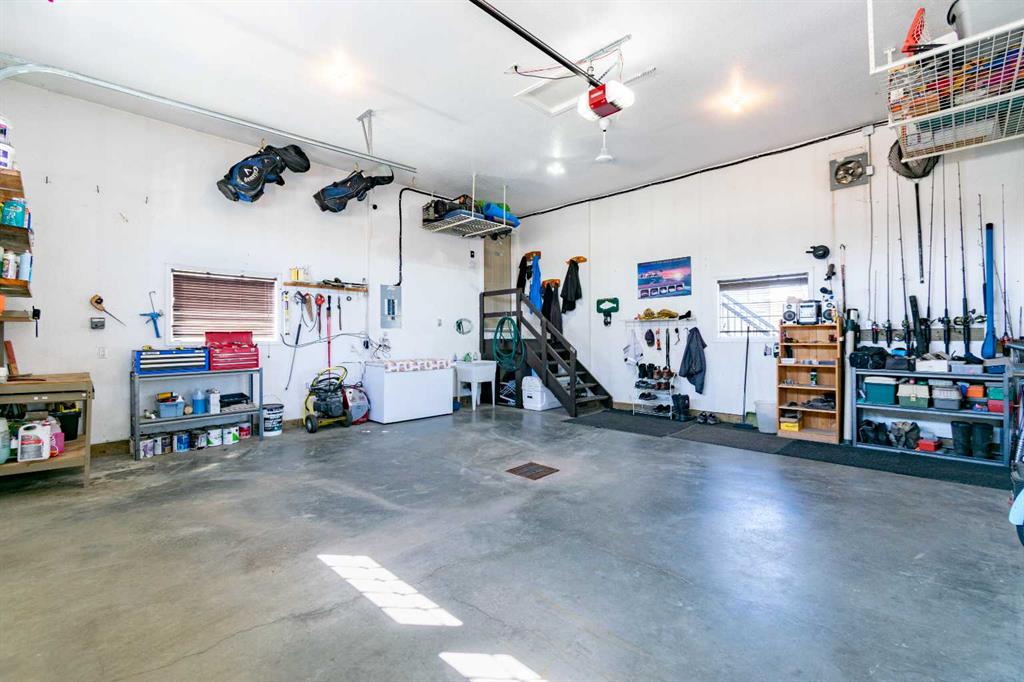 The main floor also features a spacious primary bedroom complete with a 3-piece ensuite, including a charming sweetheart tub. There is also another bedroom, and another 3 piece bathroom, complete with a custom tile walk in shower. You’ll appreciate the convenience of main floor laundry—no more trips up and down stairs—and easy access to the attached 25x25 garage, which boasts a 12-foot ceiling and a 10x16 overhead door. There are also newer Hunter Douglas blinds throughout most of the main level.