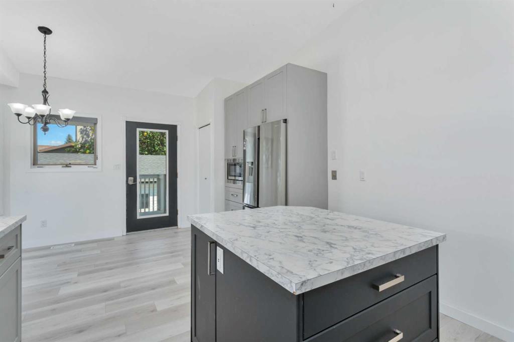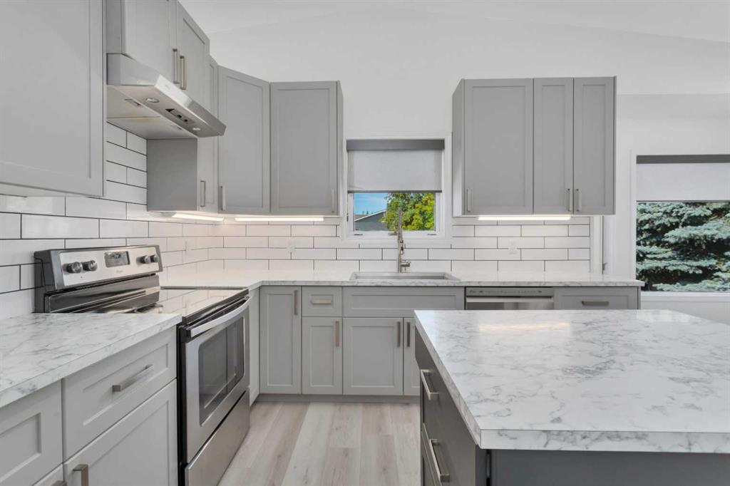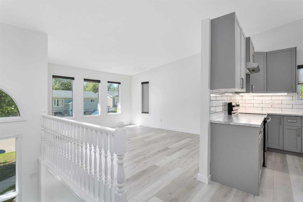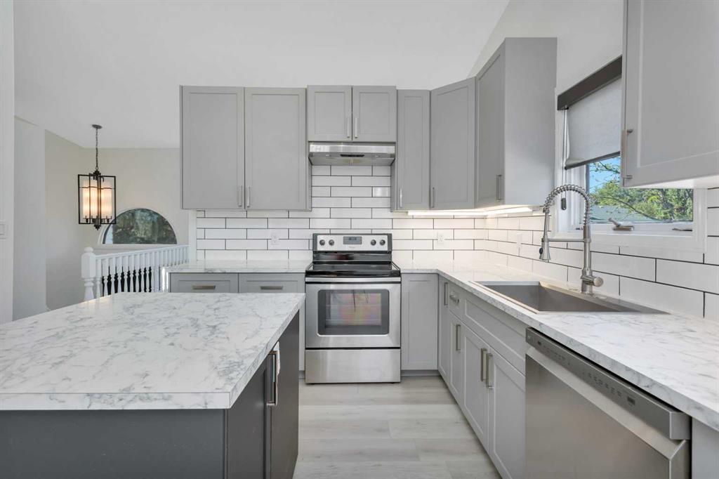 This light filled bi-level has a great layout with fabulous curb appeal. The grand front entrance is open and inviting with access to the main or huge basement. The kitchen and living room share a soaring vaulted ceiling keeping this home big and bright! The spacious living room is west facing, keeping this bright and open! The LARGE kitchen has plenty of windows, newer cabinets, and an island with storage, new taps, fresh tile backsplash & countertops, new light fixtures and stainless steel appliances. Custom blinds, a deep stainless steel farmhouse sink and undercabinet lighting elevate this room. The bay window nook offers a great place for family meals and gatherings. There is a handy storage pantry and access to the covered deck.