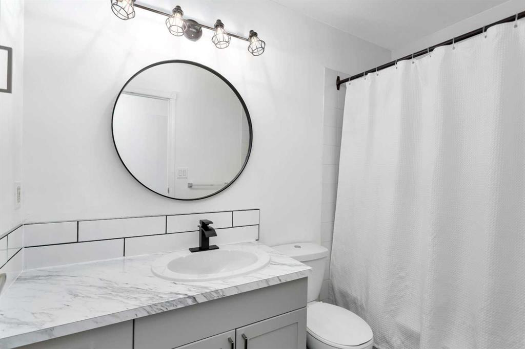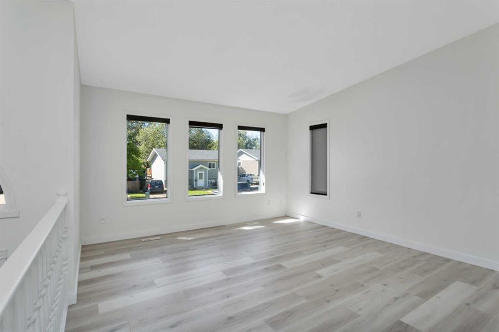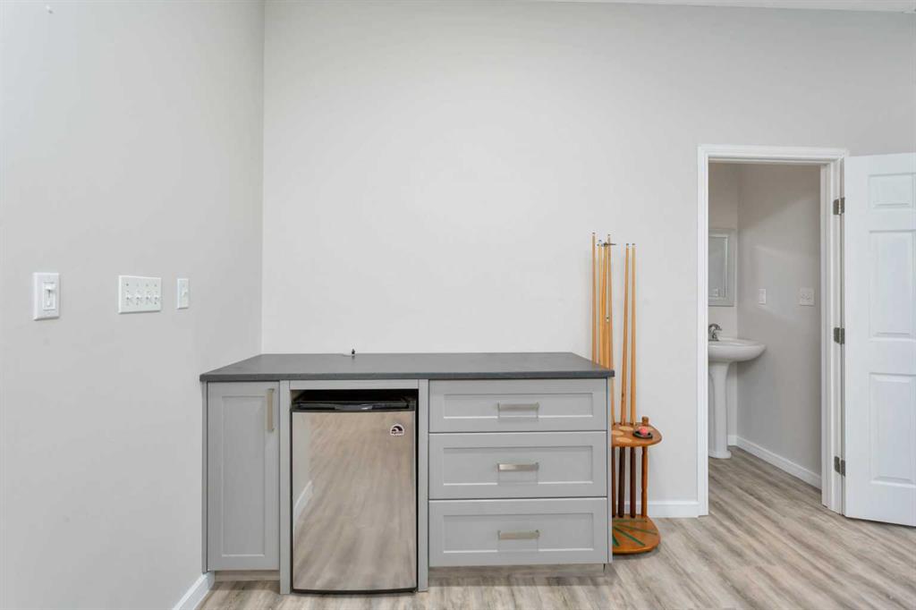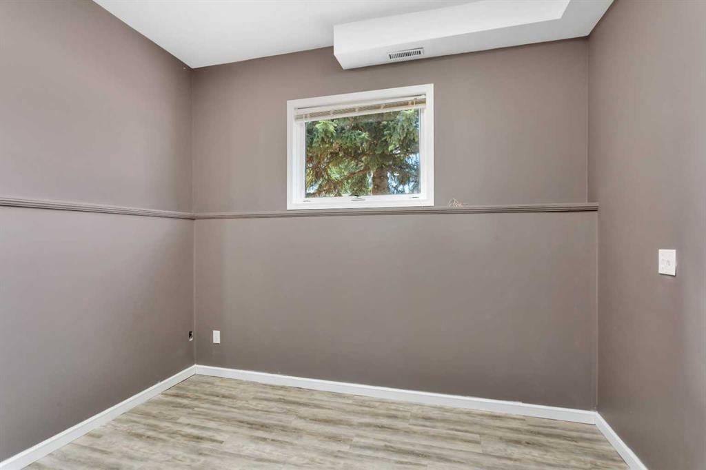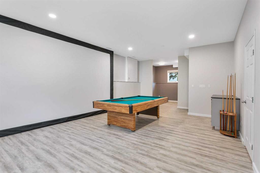 The bedrooms are tucked down the opposite hallway. The pretty primary bedroom features plush carpeting, a big window overlooking the yard, a walk in closet and a 3 piece bath. THere are two additional good sized bedrooms and a full 4 piece bath with a newer vanity, new backsplash, taps & mirror. The entire home has newly installed vinyl plank and features fresh paint and light fixtures. Heading into the basement, there’s more great spaces to explore. With almost 10’ ceilings, the rec room has huge windows keeping it big and bright!! There is a handy office nook which could also be converted to a bedroom if extra rooms are needed. The MAIN rec room features a FLOOR TO CEILING IMPACT screen. Perfect for virtual golf (projector not included) or even family movie nights. There’s a good pool table and a small dry bar for more family fun! There is also a convenient 2 piece bath tucked off this room. The other half of the basement features a big family room with a gas fireplace and additional storage. The laundry room has a wall of floor to ceiling storage cabinets along with your washer and dryer. There is also WALK UP access to the backyard!