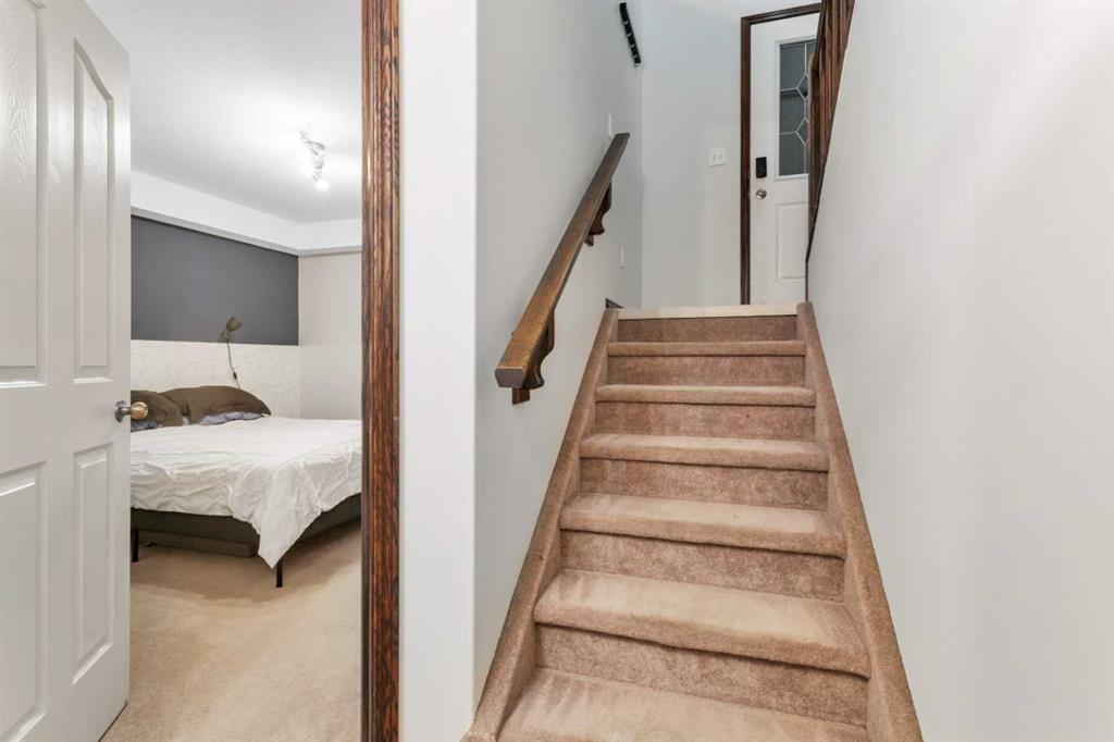 Downstairs, the basement is home to three bedrooms and a full four-piece bathroom. Large windows keep the space bright, while cozy carpet makes it comfortable year-round — warm in the winter, cool in the summer. There’s also additional storage neatly tucked under the stairs.