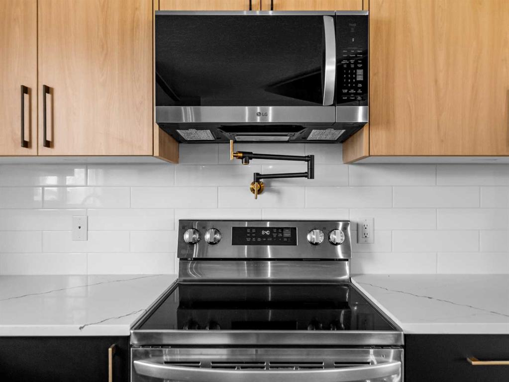fridge, stove, washer/dryer, dishwasher, microwave, wash basin sink, pot filler |