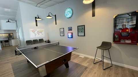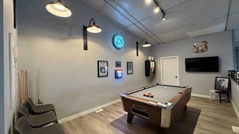 The mezzanine (480 SF) adds a full modern bathroom with shower, recreation area with pool table, curated finishes, and additional storage. An executive clubhouse experience that has no peer in this market.