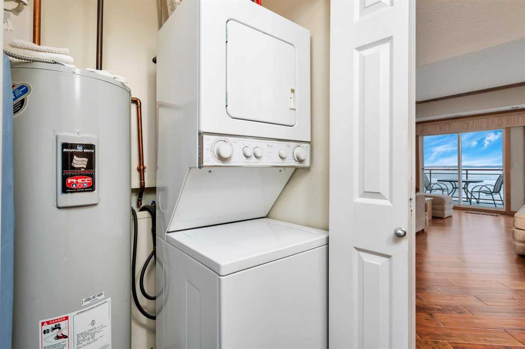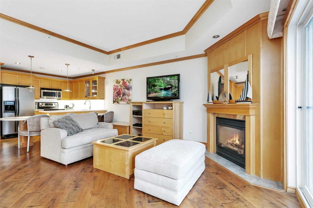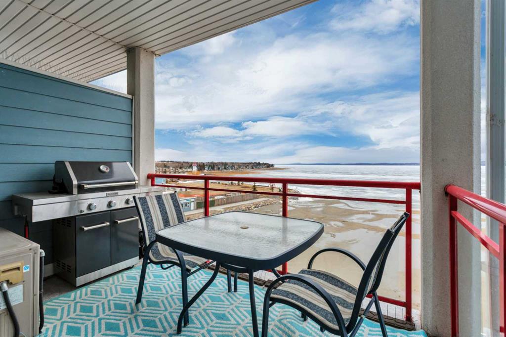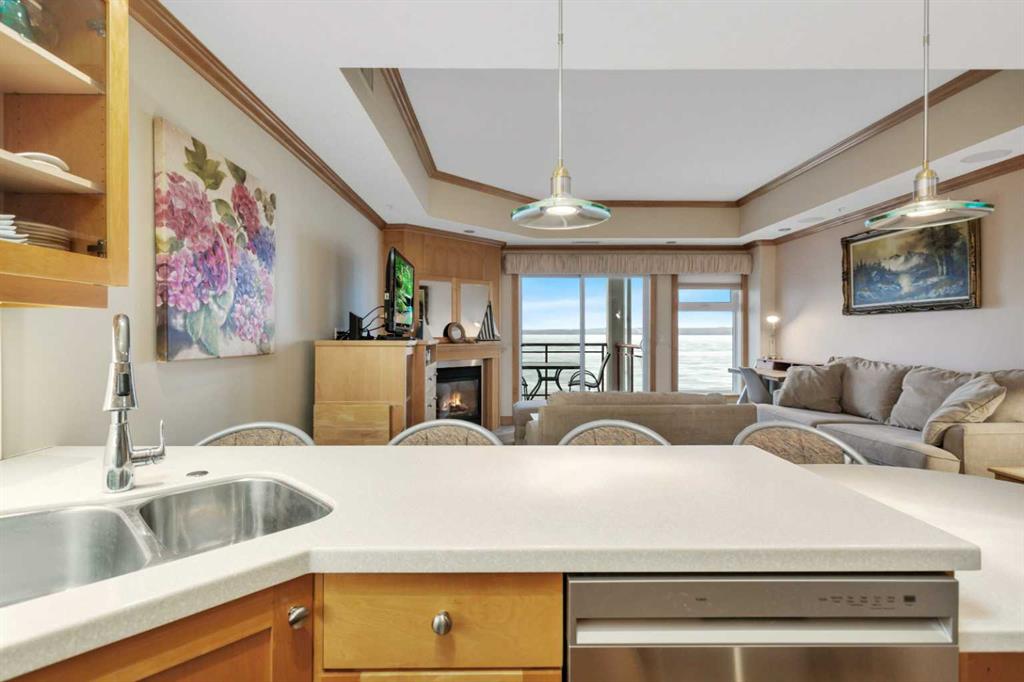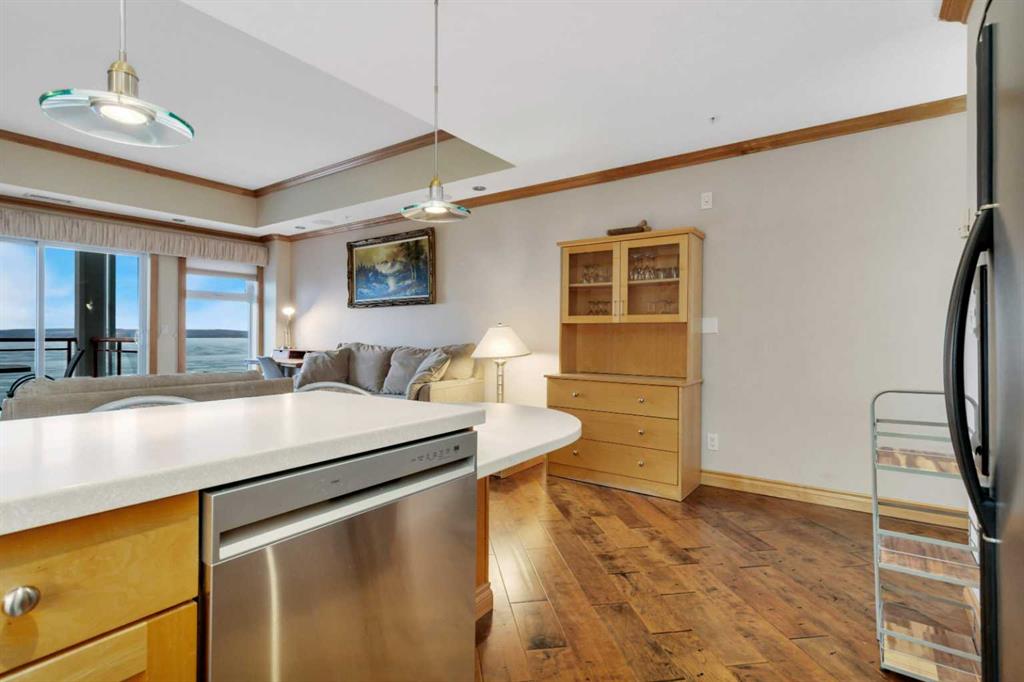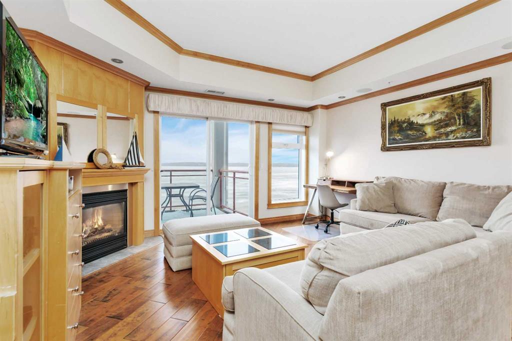 Discover elevated lakeside living in this beautifully maintained 4th-floor condo in the coveted Chateau Suites building, right on the shores of Sylvan Lake. This 1-bedroom, 1-bathroom home combines style, comfort, and unbeatable views, with a private covered balcony that offers the perfect perch to enjoy stunning sunrises over the water. Inside, you’ll find an open-concept layout with warm wood tones, a gas fireplace and large windows that bring in an abundance of natural light. The kitchen features upgraded appliances, a peninsula with seating, and ample cabinetry. The generously sized bedroom connects directly to the full bathroom, and convenient in-suite laundry is also included. This unit is being sold fully furnished and as-is, making it a true turn-key opportunity. Whether you plan to move in, rent it out, or escape to the lake on weekends, just bring your suitcase and settle in! Titled heated underground parking and a secure storage locker are included. Monthly condo fees cover ALL utilities, cable, and internet, giving you stress-free ownership. The Chateau Suites building offers unbeatable walkability to the beach, trails, downtown shops, cafes, and the vibrant lakeside atmosphere Sylvan Lake is known for.