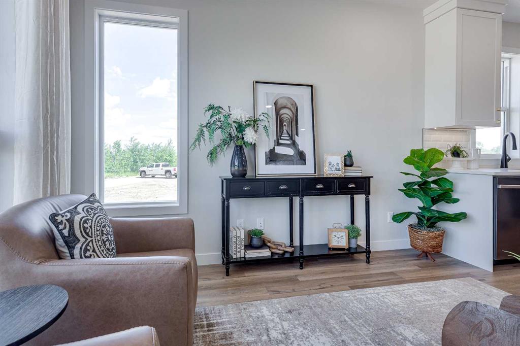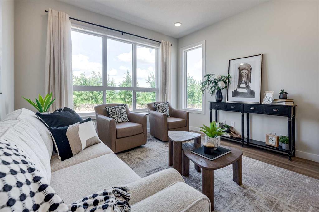 Edge Homes built bungalow with a 18x18 detached garage & main floor laundry ready for fall possession. The perfect home to downsize into, this 3 bedroom 3 bathroom unit is sure to impress your friends and family. Bright open floorplan with 9 ft ceilings and luxury vinyl plank flooring. Relax in the living room and watch the deer & wildlife in the farmers field behind. Entertain in the functional kitchen with centre island eating bar, corner pantry, soft close cabinets, under cabinet lighting, black granite sil sink, pull out garbage & recycling,  range hood and  stainless appliances. Dining room to entertain your friends, leads to handy back bench with decorative hooks, back door with with full glass/blind insert, back deck with privacy wall. 2 piece powder room for guests. Spoil yourself with this stunning primary bedroom with carpet flooring, huge walk in closet 4 piece ensuite with double sinks, stand up shower with glass door and seat. Basement is complete with family room, 2 more bedrooms one with a massive walk in closet for extra storage, 4pce bathroom. 9 foot ceilings and large windows make this basement perfect for teens or guests. High efficiency furnace, 40 gal high efficiency hot water tank. Front yard is landscaped with front sod,  back yard is  levelled with black dirt and has 18x18 detached garage. Located in Grayhawk on the west side of Sylvan Lake, with easy access to all town amenities, the lake, golf course, shopping, highway access and surrounded by walking paths and trails. GST included in purchase price with rebate to the builder. 1-2-5-10 New home warranty. Taxes to be assessed. Measurements & pics will be updated as build progresses, photos and renderings are examples from a similar home built previously and do not necessarily reflect the finishes and colors used in this home.