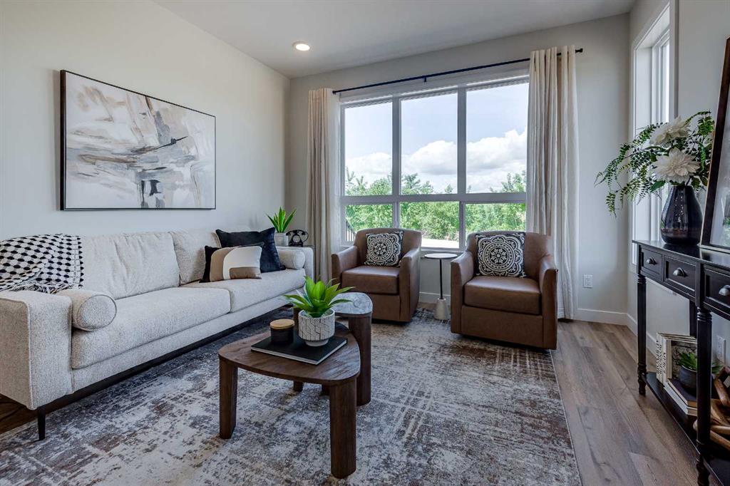 Imagine starting your mornings with coffee on a sunny south-facing deck, then strolling peaceful walking paths just steps from your door. This brand new modern bungalow townhouse in Sylvan Lake’s new Grayhawk community offers the perfect blend of style, comfort, and convenience—without the condo fees. Whether you’re hosting friends in your open-concept living space, planning future basement movie nights, or simply enjoying the quiet of your own backyard, this home is designed to fit the way you live. Impressive primary bedroom with beautiful ensuite, has double sinks, stand up shower with glass door and large walk in closet. 2 pce powder room for guests and handy main floor laundry. Bright open floor plan with functional kitchen, corner pantry, quartz countertops, stainless steel appliances. Luxury vinyl plank flooring throughout living, dining and kitchen area plus the 9 ft ceilings make it feel spacious. Basement is undeveloped but has potential for family room, 2 more bedrooms, and another 4pce bathroom. You’ll be close to the lake, golf courses, and all the amenities you need, yet tucked away in a peaceful neighborhood that feels like a retreat. Built for energy efficiency and backed by a New Home Warranty, it’s a home that offers peace of mind as much as it does beauty. Front yard comes with sod and back yard will be levelled to grade with black dirt. 2 stall gravel parking pad. Proposed completion is set for Spring 2026—yours to look forward to. GST included with purchase price rebate to the builder. Taxes to be assessed. All pictures are of similar home and may not be exact.