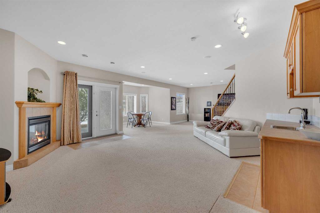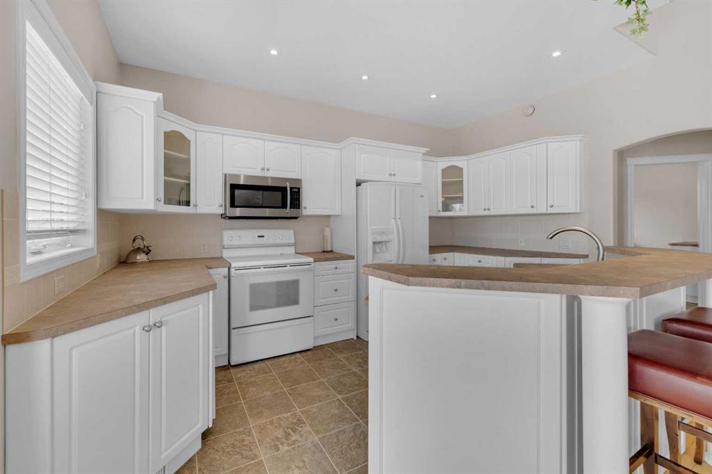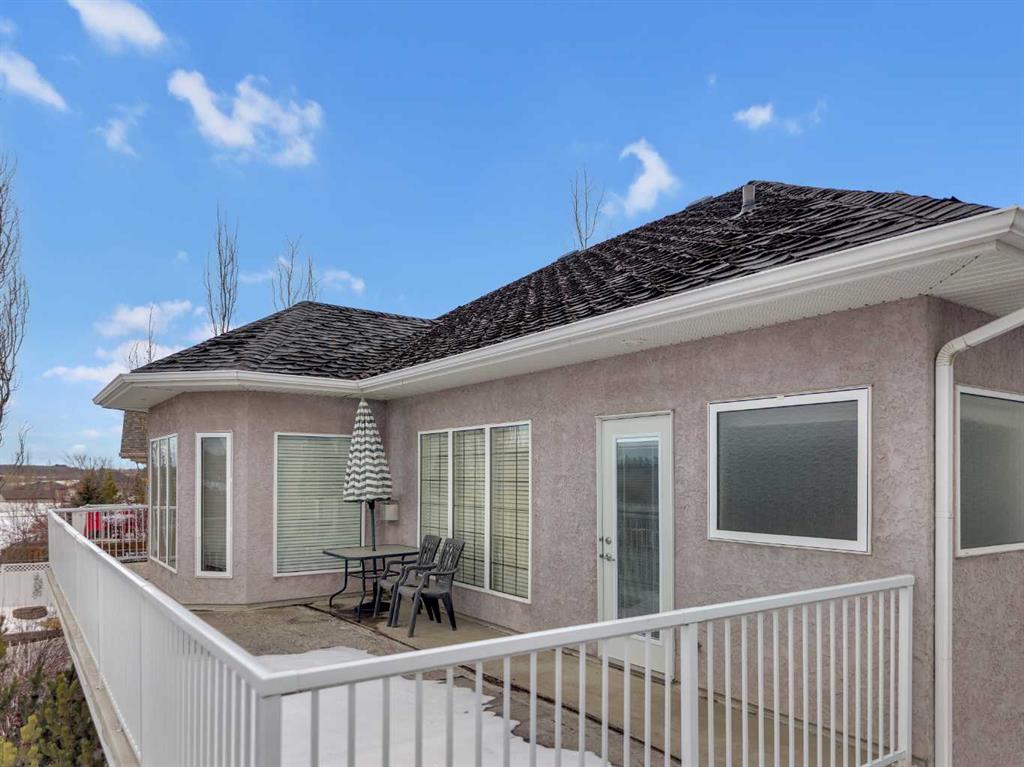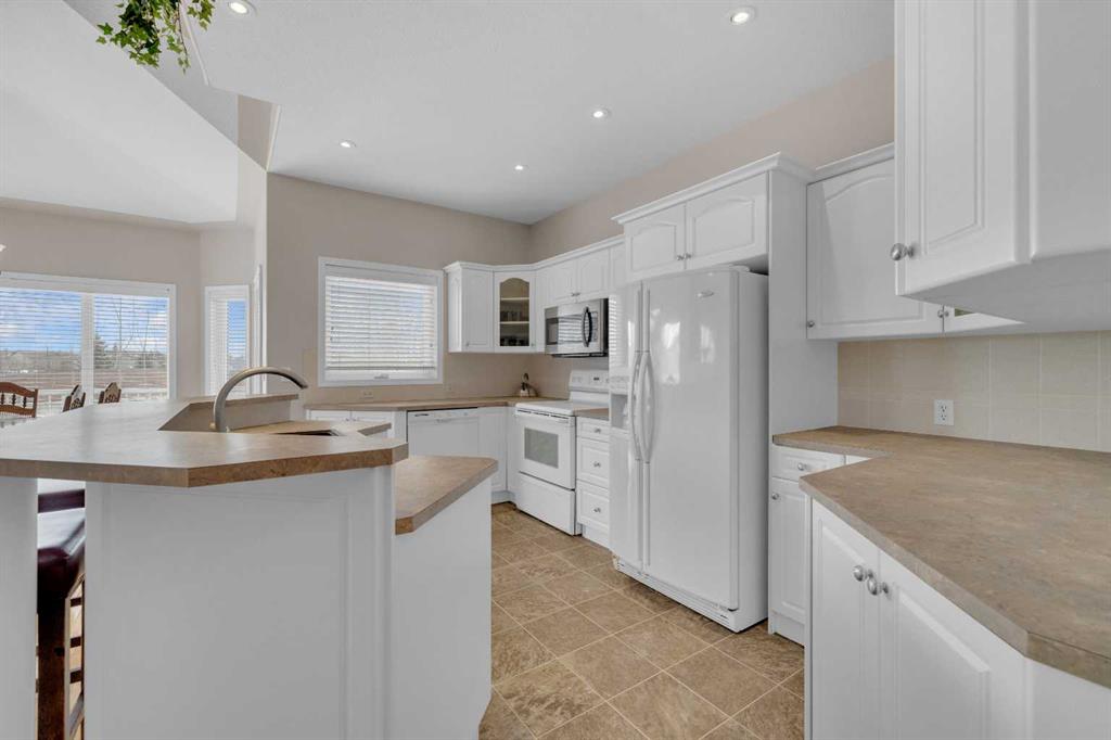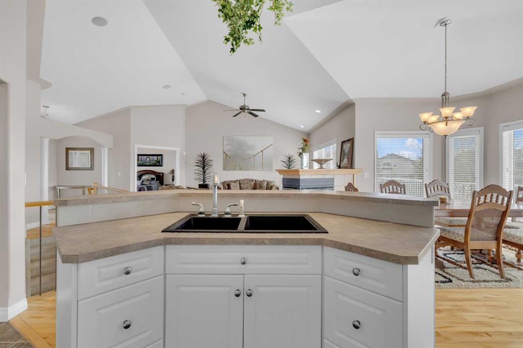 Tucked into a quiet, established close, this 1470 sq ft walkout bungalow sits on a large southwest-facing pie lot, a combination that is extremely difficult to find in town. Properties with this layout, lot orientation, and location are exceptionally rare. The bright open main floor features vaulted ceilings and oversized windows that fill the home with natural light. The kitchen offers abundant cabinetry, generous counter space, and a large island that flows into the dining and living areas. The spacious primary bedroom includes a walk-in closet, ensuite with jet tub and separate shower, and direct access to the back deck.