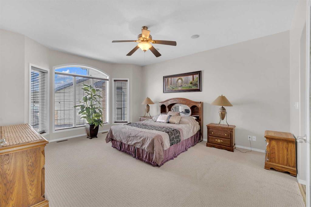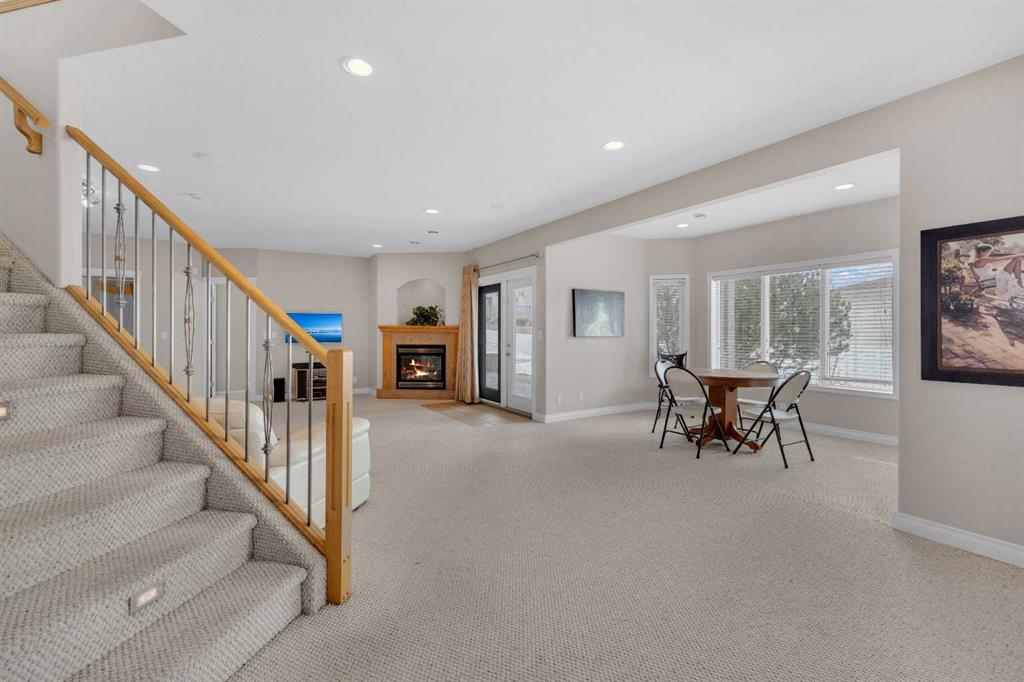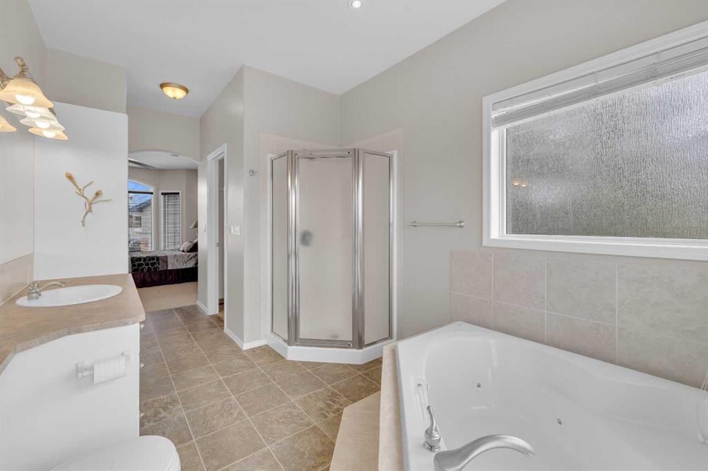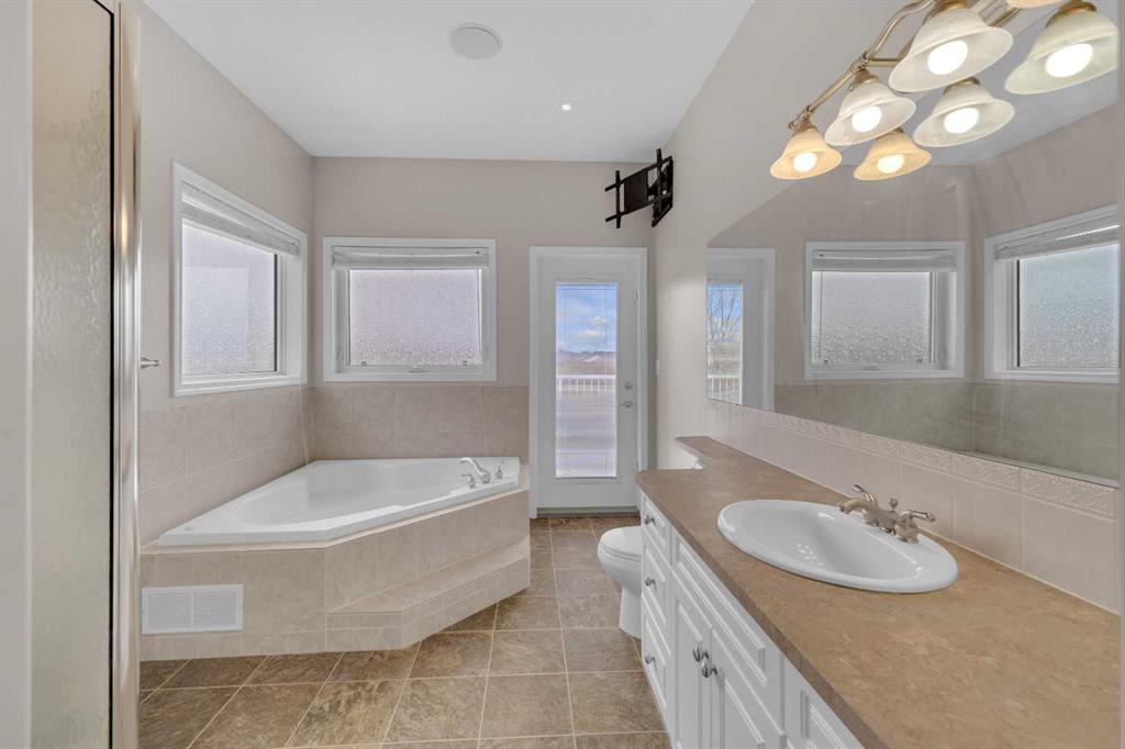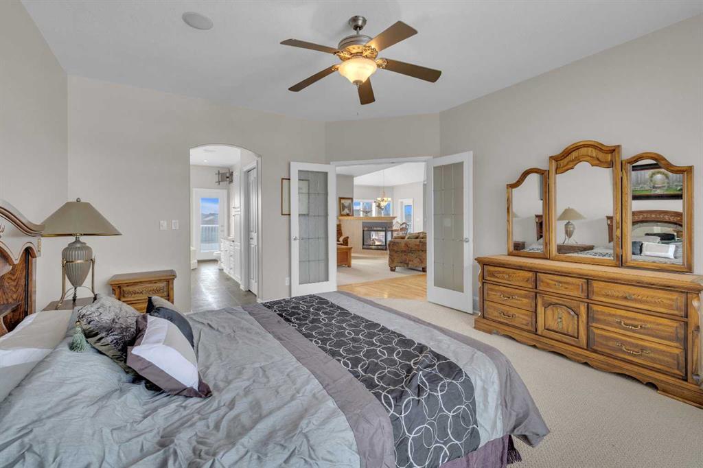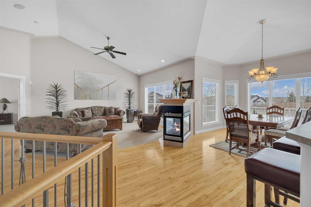 Tucked into a quiet, established close, this 1470 sq ft walkout bungalow sits on a large southwest-facing pie lot, a combination that is extremely difficult to find in town. Properties with this layout, lot orientation, and location are exceptionally rare. The bright open main floor features vaulted ceilings and oversized windows that fill the home with natural light. The kitchen offers abundant cabinetry, generous counter space, and a large island that flows into the dining and living areas. The spacious primary bedroom includes a walk-in closet, ensuite with jet tub and separate shower, and direct access to the back deck.