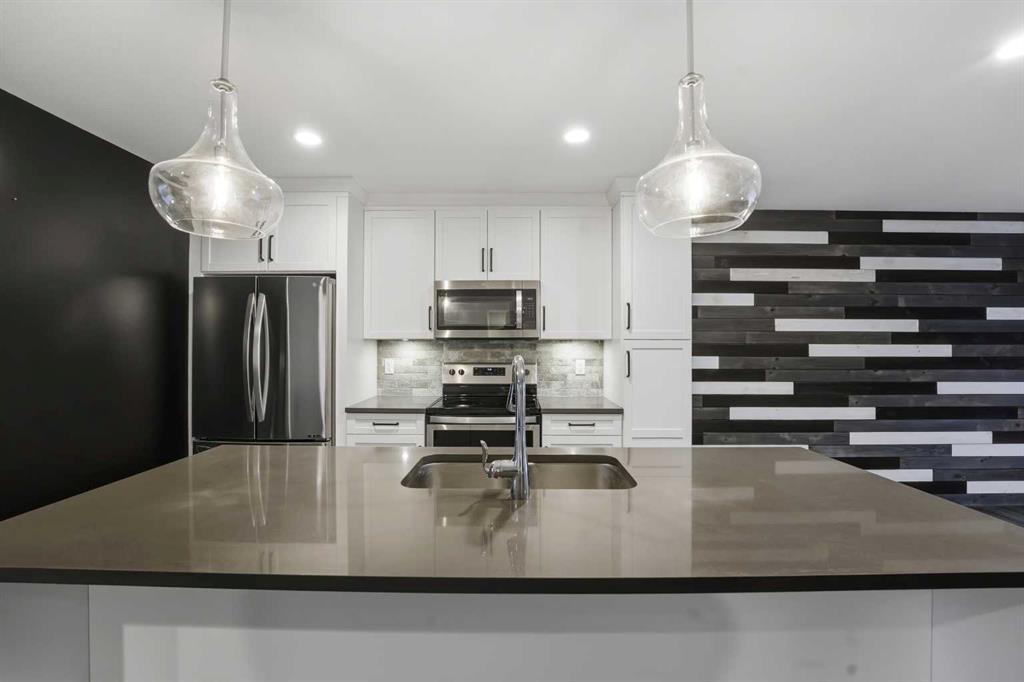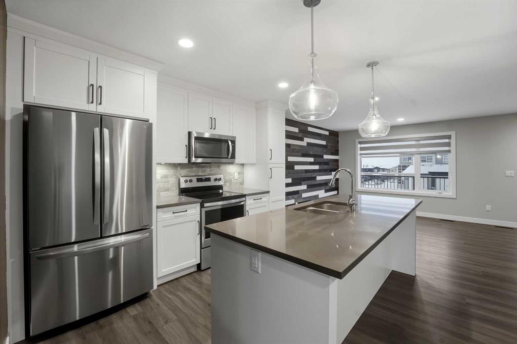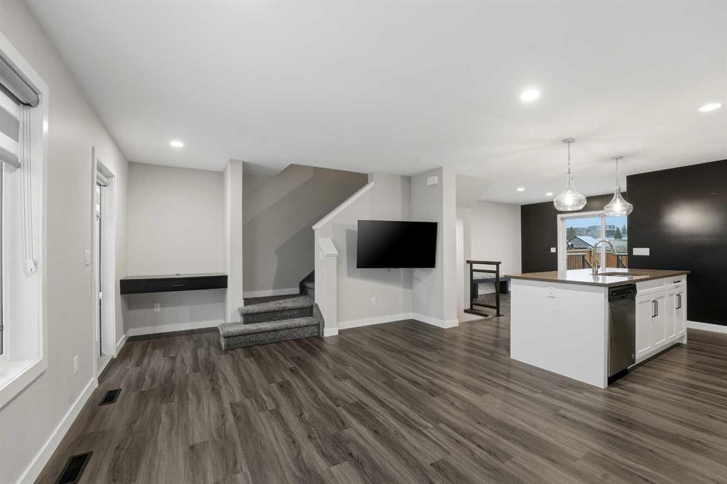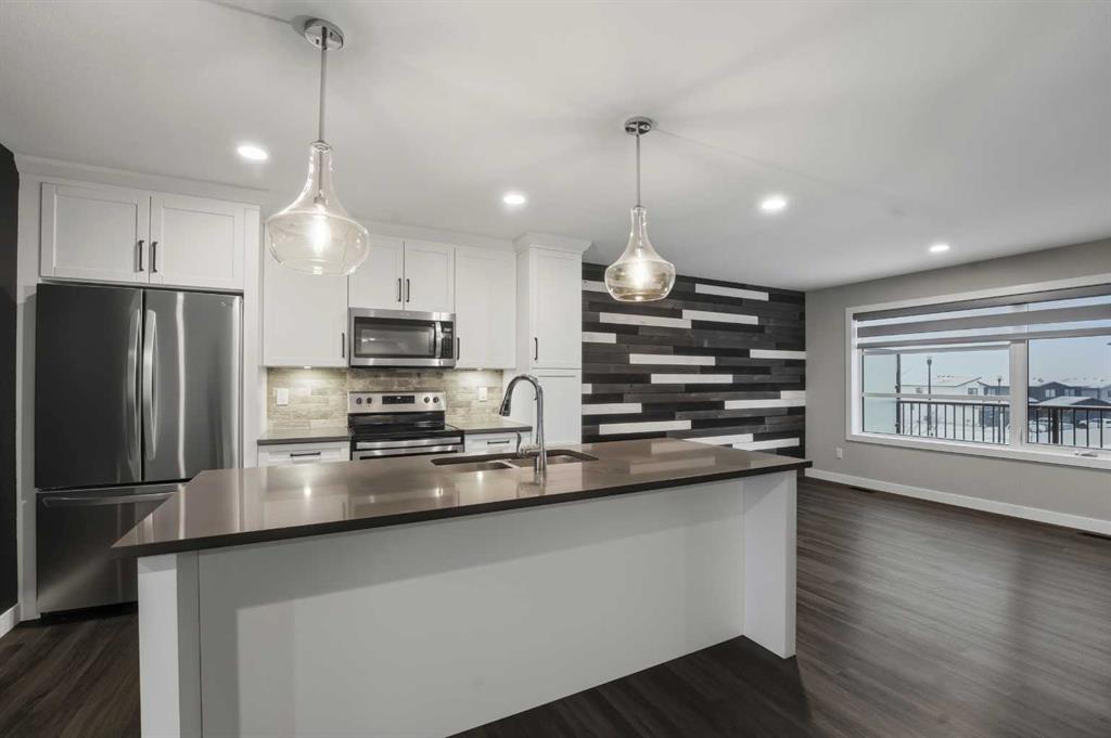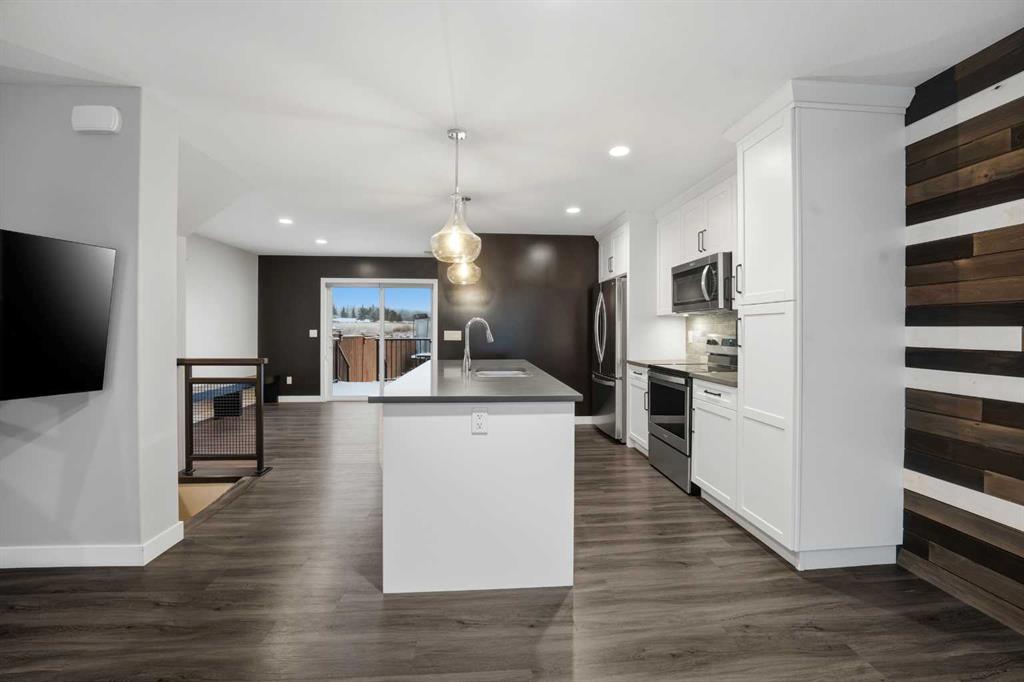 You’ll love the open-concept layout of the main floor that features a modern kitchen with stainless steel appliances, a large island, quartz countertops, tile backsplash and gorgeous white cabinetry with plenty of storage. The bright family room opens onto a zero-maintenance balcony with beautiful Sylvan Lake views. A convenient 2-pc bathroom with in-suite laundry is tucked behind a barn door. Off the dining room, patio doors lead to the fully fenced and landscaped yard that backs onto open fields. Ideal for privacy and those stunning Alberta sunsets.