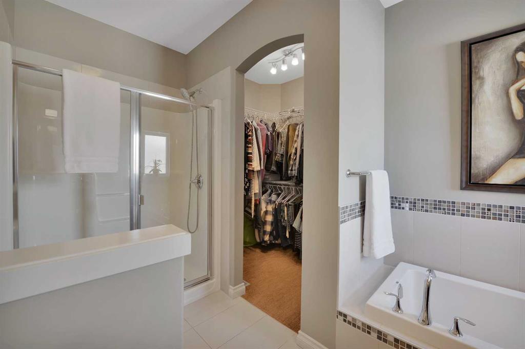The home features hardwood and tile flooring, a maple kitchen with upgraded stainless steel appliances, central air conditioning, central vacuum, water softener, and convenient main floor laundry. The large primary bedroom offers a walk-in closet and a private ensuite complete with separate shower and soaker tub. A front office (or second bedroom) is located near another 4-piece bath.
